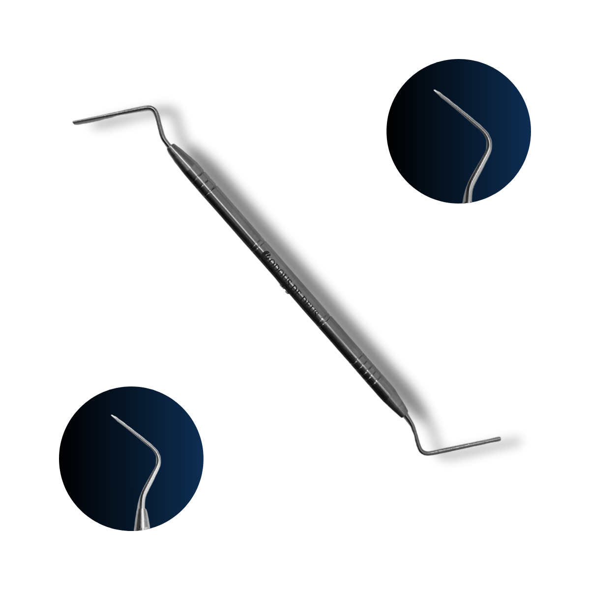 O Condensador dupla face (3-5) para compactação vertical/lateral de guta-percha e cimentos, cobrindo do terço médio ao apical com excelente controle tátil.