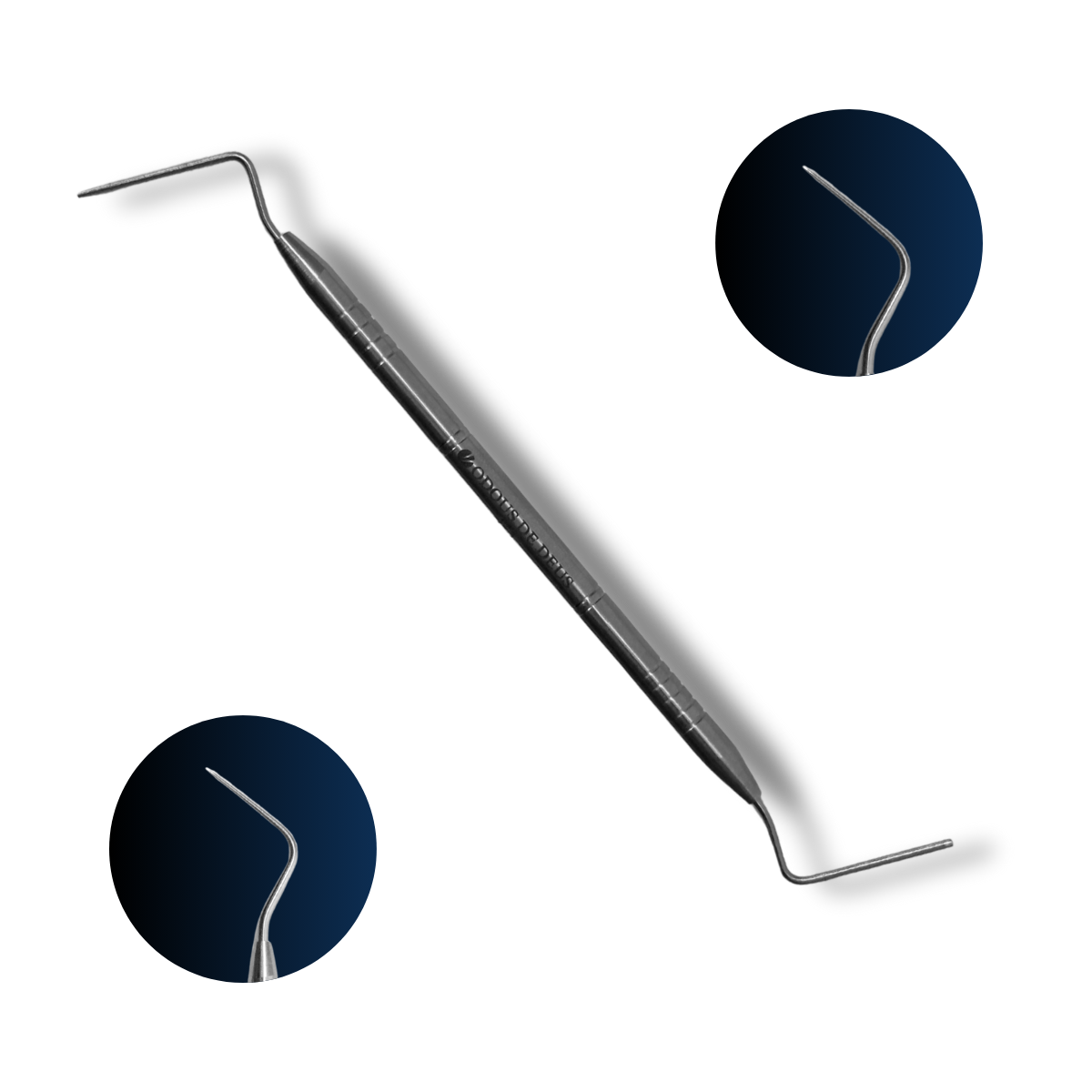 O Condensador dupla face (4-5) para compactação vertical/lateral de guta-percha e cimentos, cobrindo do terço médio ao apical com excelente controle tátil.