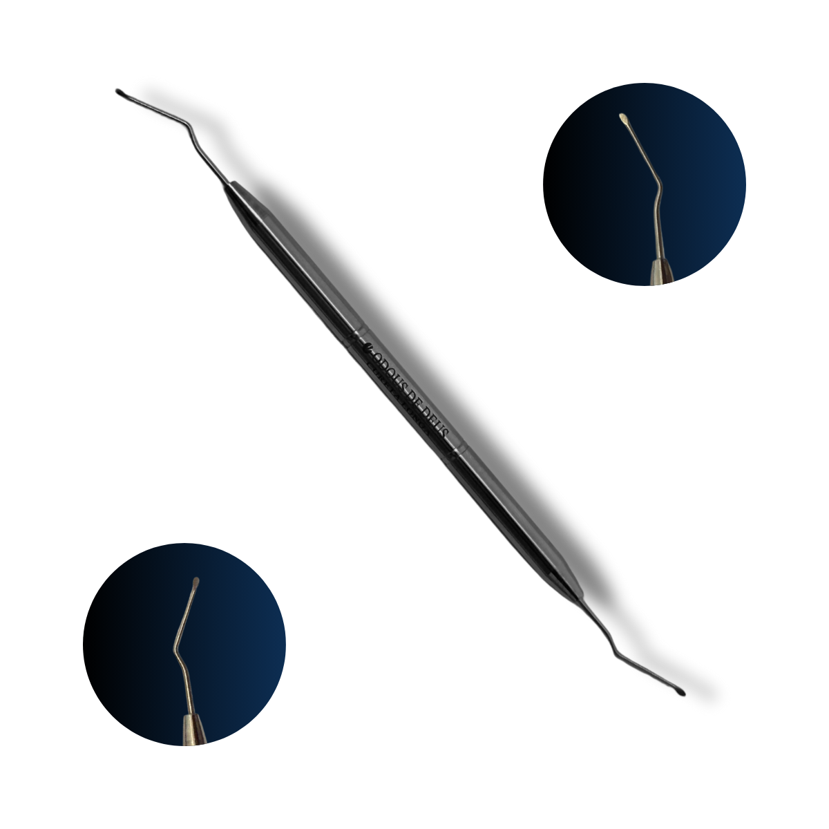 Cureta de haste longa para remoção precisa de tecido de granulação e detritos em áreas profundas, com excelente alcance e controle em retropreparo/cirurgias endodônticas.