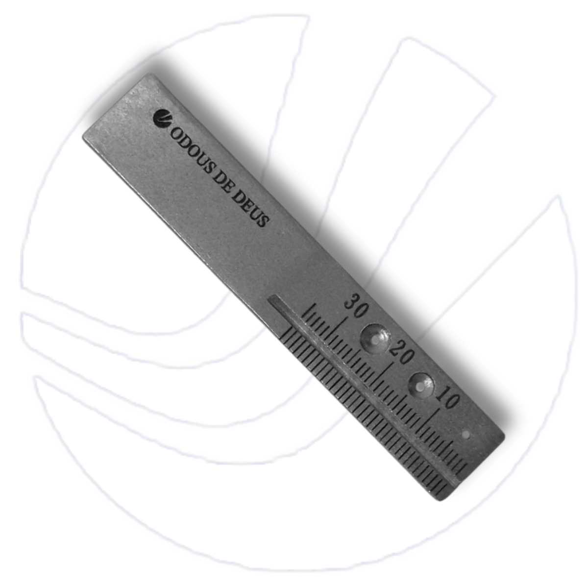 Régua endodôntica com 3 furos para posicionamento de limas/cones e escala milimetrada gravada a laser. Ajuste preciso do comprimento de trabalho e conferência rápida no consultório. Autoclavável.